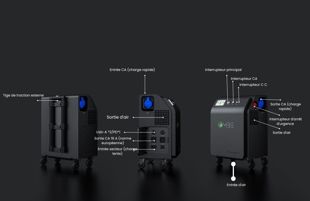 La borne électrique portable est équipée de systèmes de sécurité avancés, comme une protection contre la surcharge, la surchauffe et les courts-circuits, pour garantir une utilisation fiable et sans risque.